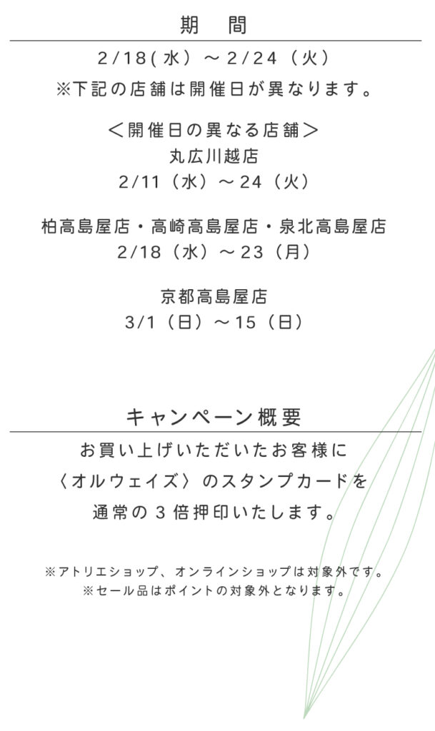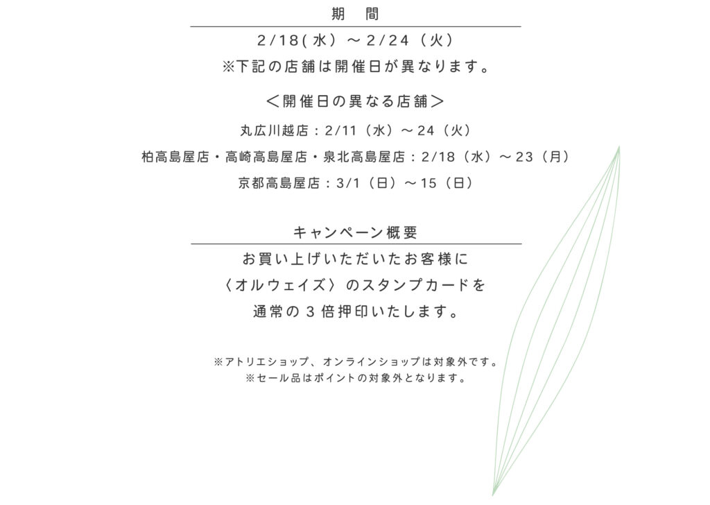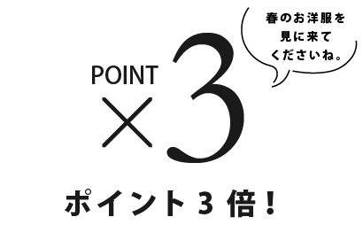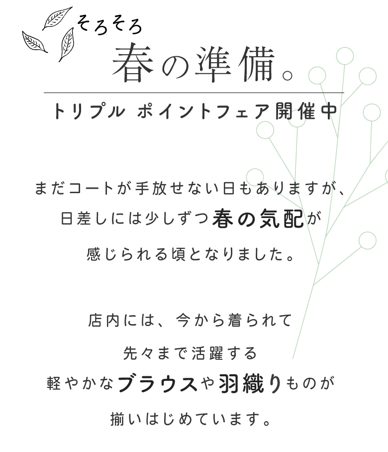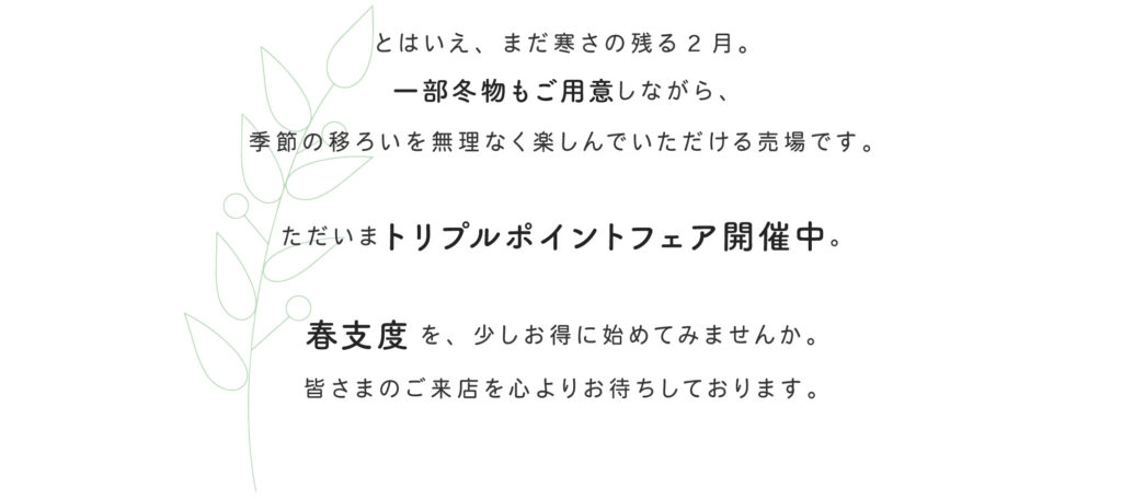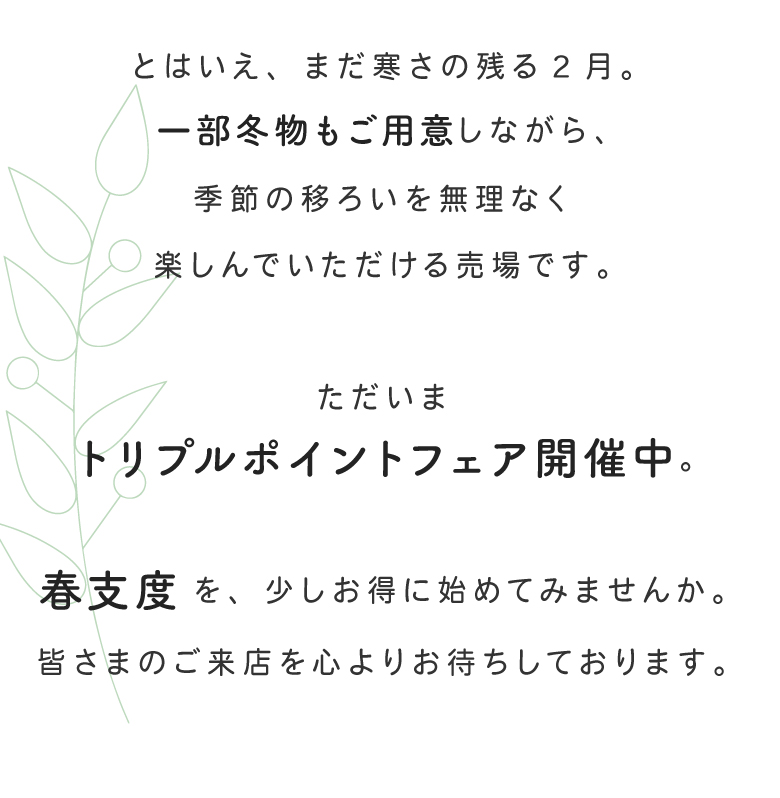 オルウェイズ3倍ポイントキャンペーン開催 news 2026.2.20-金曜日 そろそろ春の準備。トリプルポイントフェア開催中。まだコートが手放せない日もありますが、日差しには少しずつ春の気配が感じられる頃となりました。 店舗住所や電話番号など詳しくはこちらのショップリストをご覧ください。