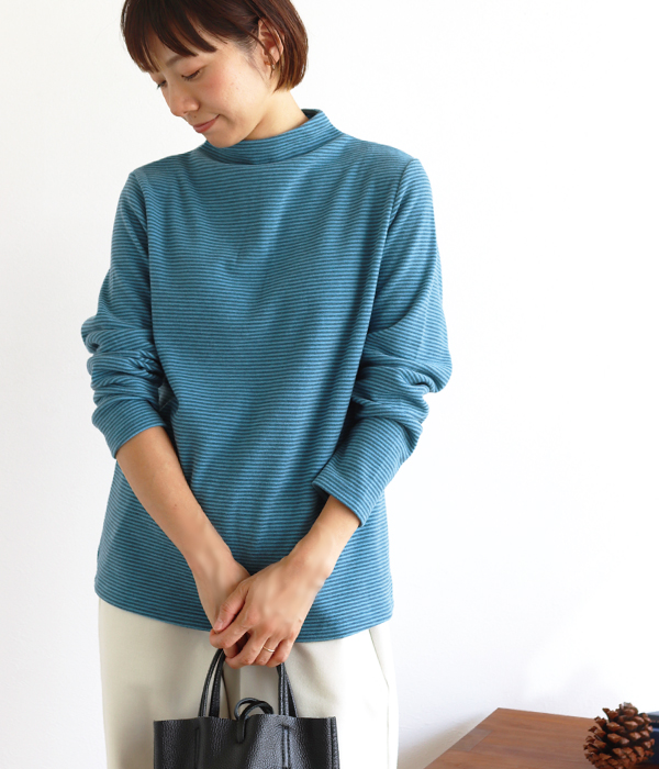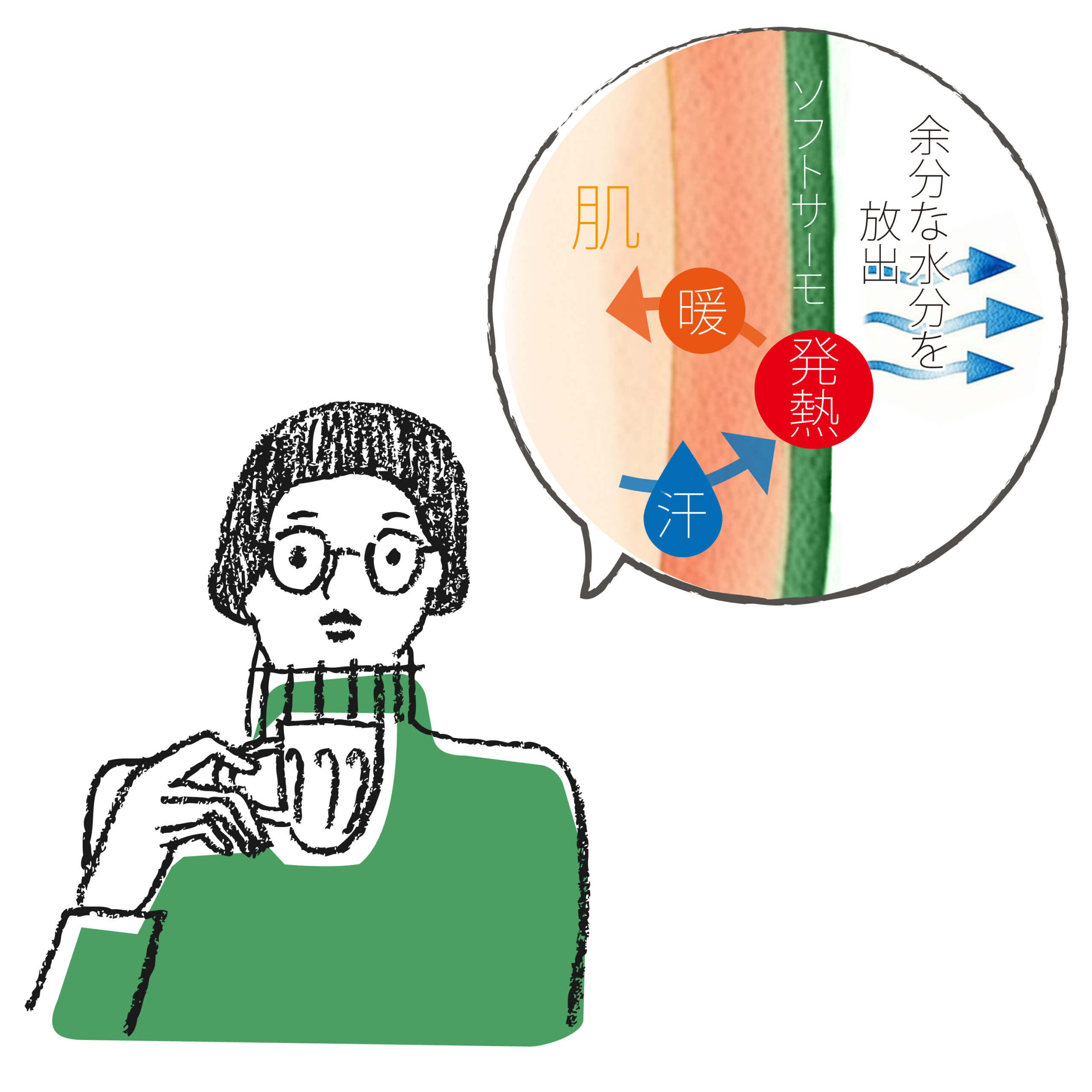 “ソフトサーモ®α”は、東レがドイツの特殊レーヨン〈バイロフト〉と、毛玉になりにくいアクリルを組み合わせて開発した日本製の機能素材。繊維の間にできる空気の層がぬくもりを逃さず、湿気を吸収して発熱。ムレを防いで、いつもさらりと快適な着心地を叶えます。
