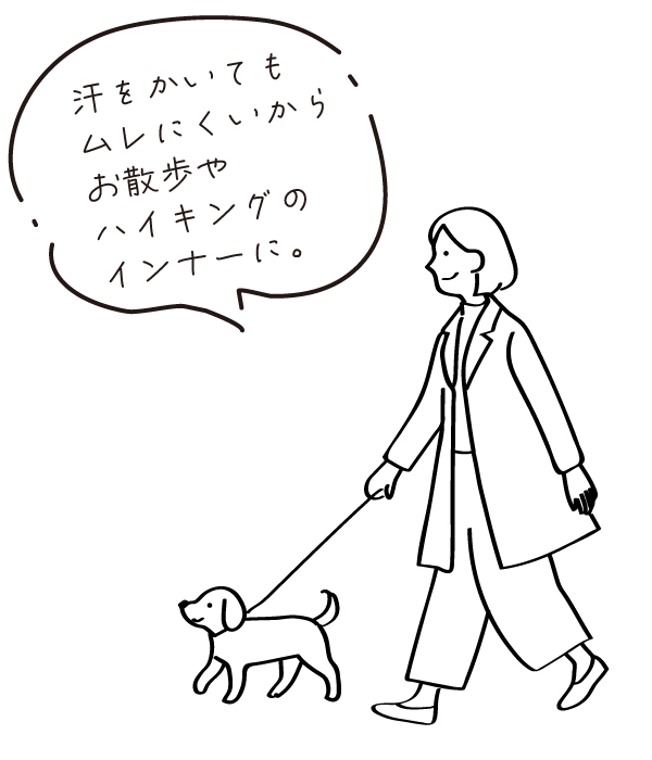 汗をかいてもムレにくいから、お散歩やハイキング・ウォーキングなどのインナーにもぴったり。