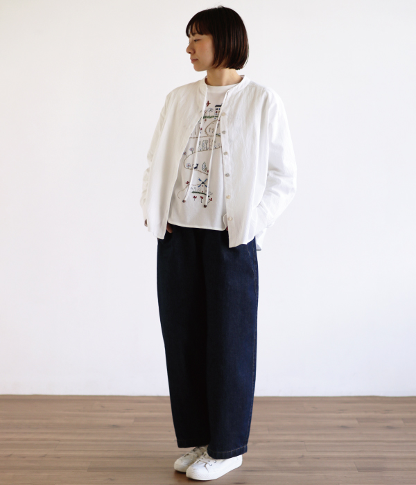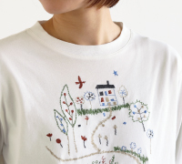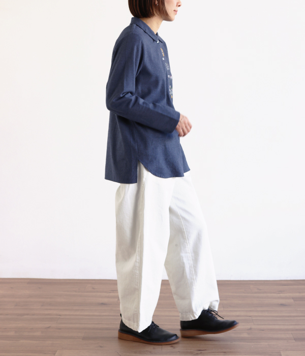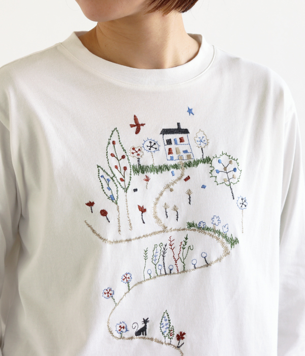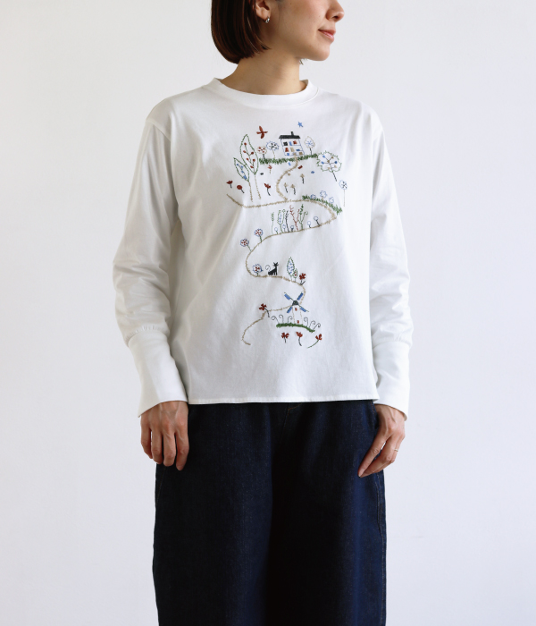 絵本の1ページのような刺繍が愛らしいプルオーバーを合わせました。