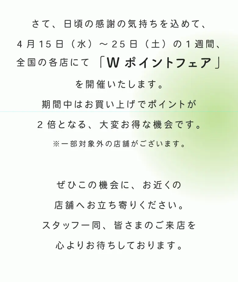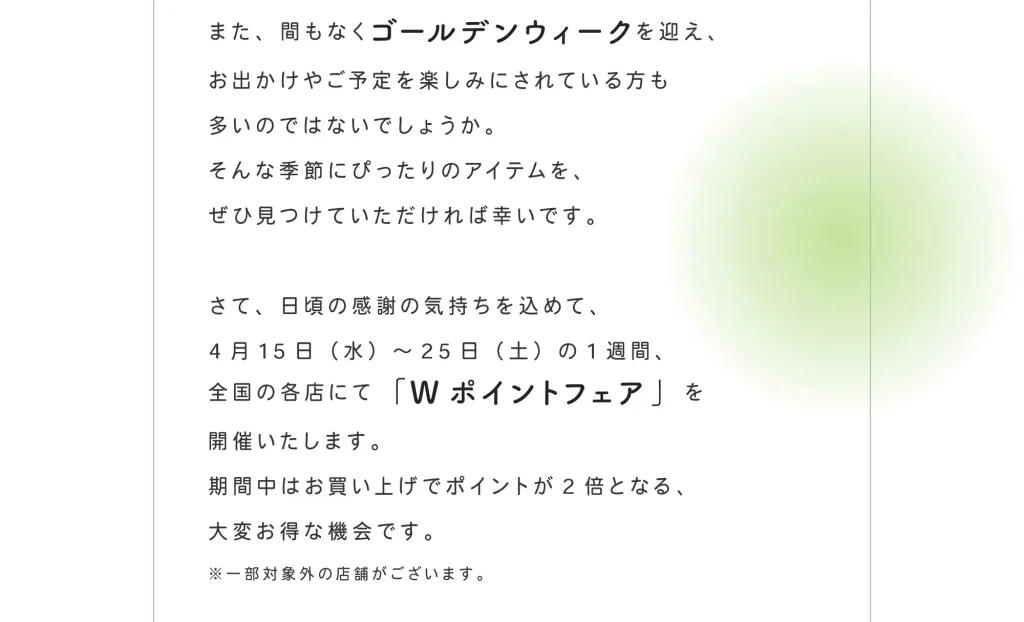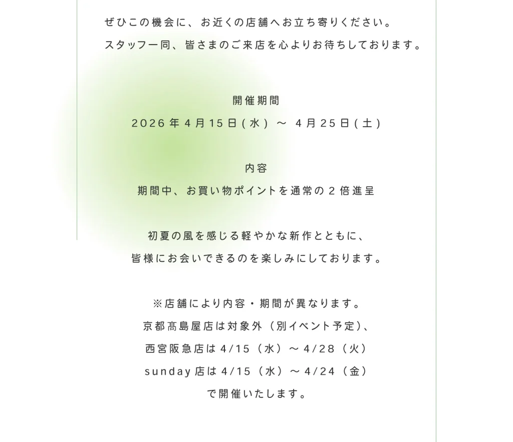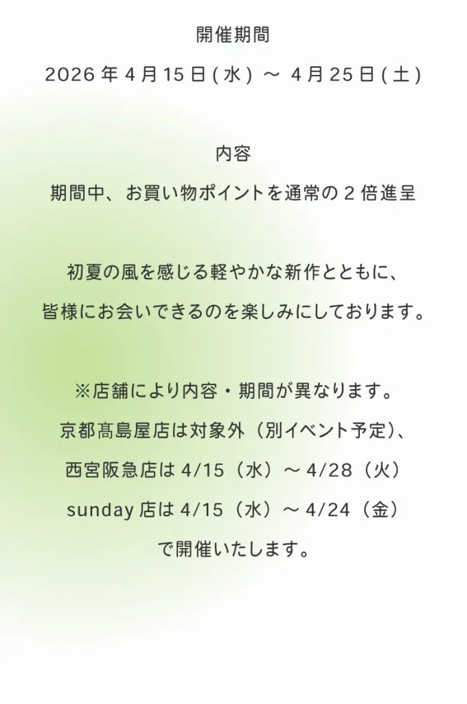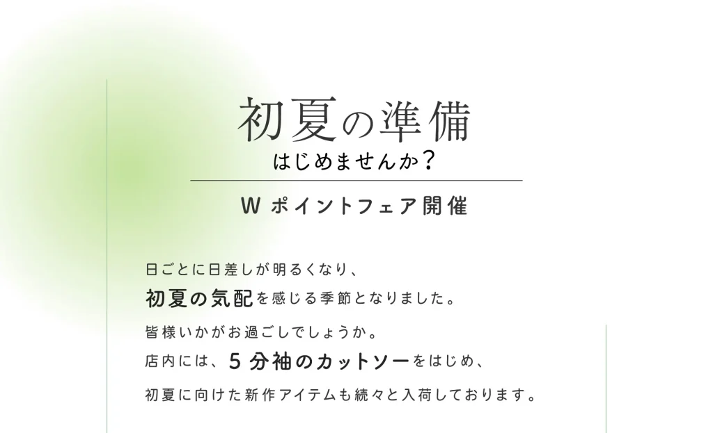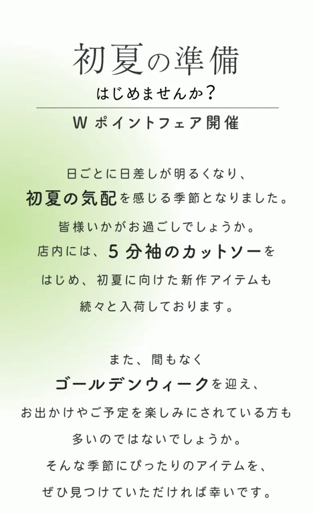 オルウェイズ初夏のWポイントキャンペーン開催! news 2026.4.14-火曜日 日ごとに日差しが明るくなり、初夏の気配を感じる季節となりました。皆様いかがおすごしでしょうか。店内には五分袖のカットソーをはじめ、初夏に向けた新作アイテムも続々と入荷しております。 店舗住所や電話番号など詳しくはこちらのショップリストをご覧ください。