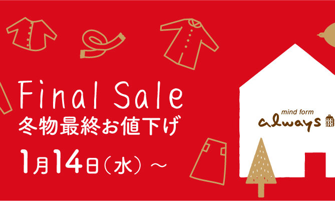 いつもマインドフォームオルウェイズをご利用いただき、誠にありがとうございます。1月14日(水)より、全店舗にて今季秋冬アイテムのファイナルセールがスタートいたします。気になっていたあの一着に、もう一度出会えるかもしれません。ぜひこの機会にご...